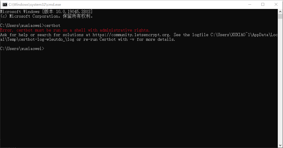 需要管理员权限运行 certbot 命令,否则将会出现以下异常