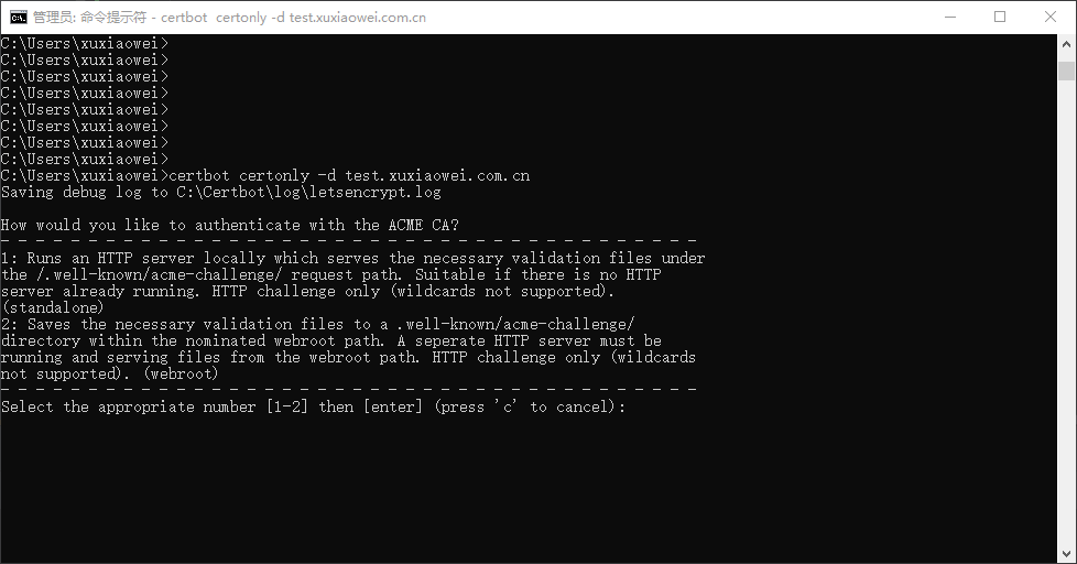 C:\Users\xuxiaowei>certbot certonly -d test.xuxiaowei.com.cn Saving debug log to C:\Certbot\log\letsencrypt.log How would you like to authenticate with the ACME CA? - - - - - - - - - - - - - - - - - - - - - - - - - - - - - - - - - - - - - - - - 1: Runs an HTTP server locally which serves the necessary validation files under the /.well-known/acme-challenge/ request path. Suitable if there is no HTTP server already running. HTTP challenge only (wildcards not supported). (standalone) 2: Saves the necessary validation files to a .well-known/acme-challenge/ directory within the nominated webroot path. A seperate HTTP server must be running and serving files from the webroot path. HTTP challenge only (wildcards not supported). (webroot) - - - - - - - - - - - - - - - - - - - - - - - - - - - - - - - - - - - - - - - - Select the appropriate number [1-2] then [enter] (press 'c' to cancel):C:\Users\xuxiaowei>certbot certonly -d test.xuxiaowei.com.cn 正在将调试日志保存到C:\Certbot\log\letsencrypt.log 您希望如何向ACME CA进行身份验证? - - - - - - - - - - - - - - - - - - - - - - - - - - - - - - - - - - - - - - - - 1:在本地运行HTTP服务器,该服务器在下提供必要的验证文件 /.well-known/acme-challenge/ 请求路径。适用于没有HTTP的情况 服务器已在运行。仅HTTP质询(不支持通配符)。 (独立) 2:将必要的验证文件保存到 .well-known/acme-challenge/ 指定的webroot路径中的目录。必须有一个单独的HTTP服务器 从webroot路径运行和提供文件。仅HTTP质询(通配符 不支持)。(webroot) - - - - - - - - - - - - - - - - - - - - - - - - - - - - - - - - - - - - - - - - 选择适当的数字[1-2],然后[输入](按“c”取消): -