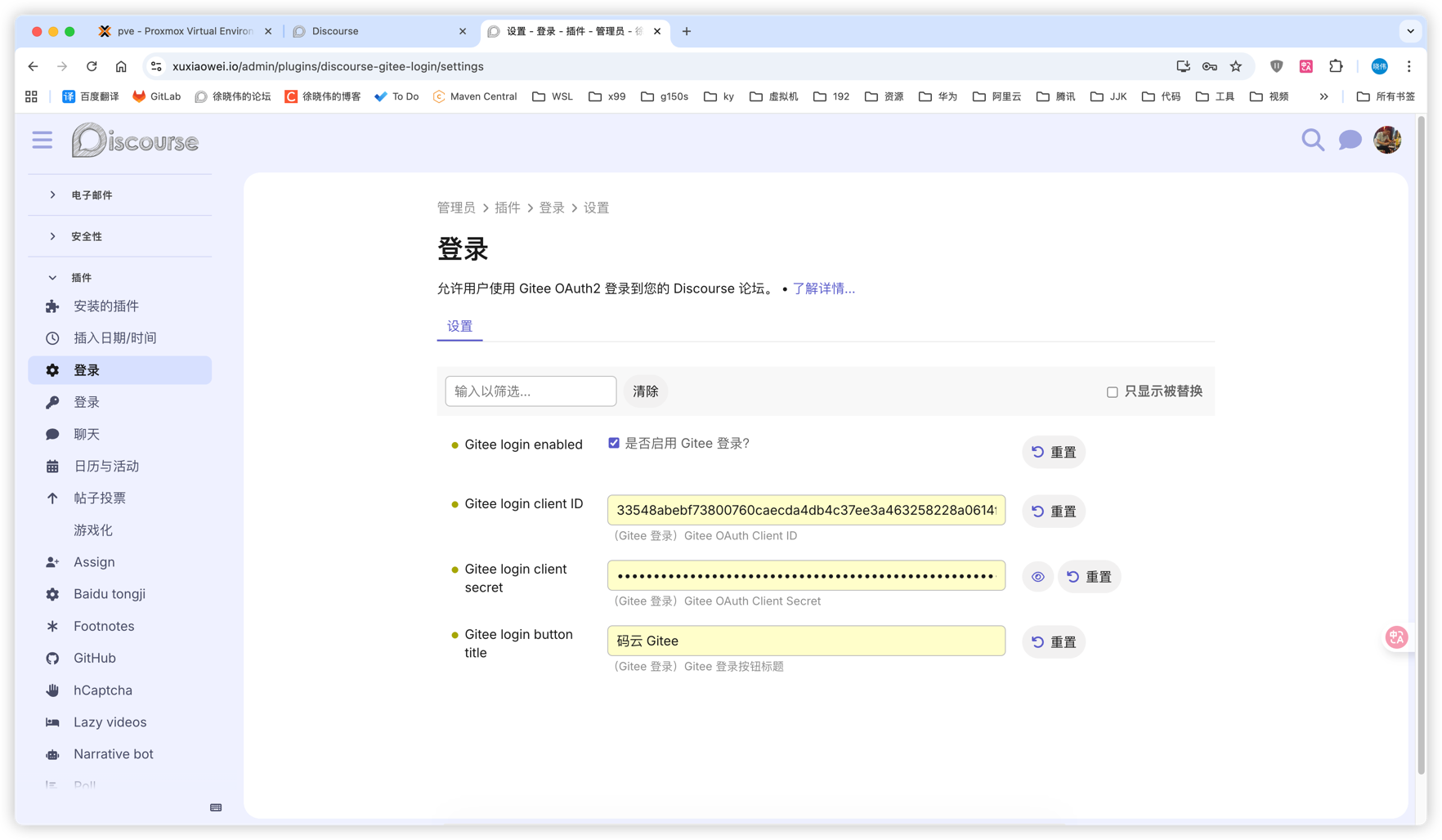 /var/www/discourse/pluginsdocker exec -it discourse-web-1 bash cd /var/www/discourse/plugins git clone https://github.com/xuxiaowei-com-cn/discourse-gitee-login.git - 重启容器