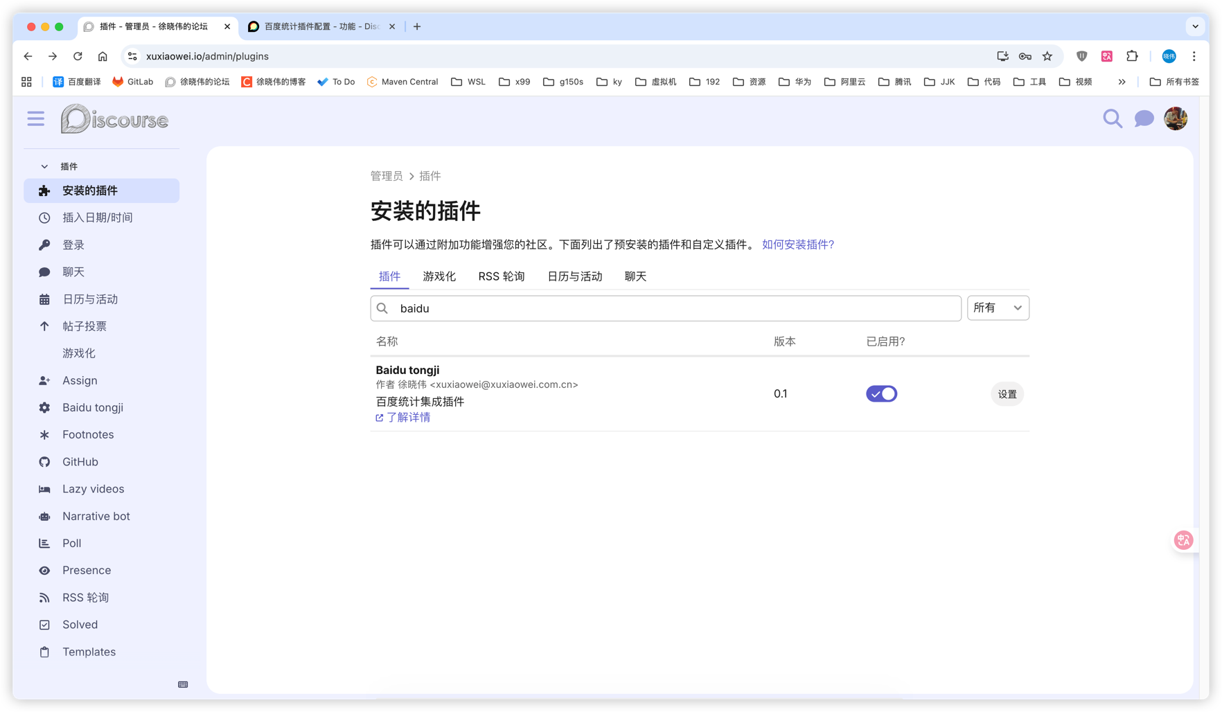 /var/www/discourse/pluginsdocker exec -it discourse-web-1 bash cd /var/www/discourse/plugins git clone https://github.com/xuxiaowei-com-cn/discourse-baidu-tongji.git - 重启容器