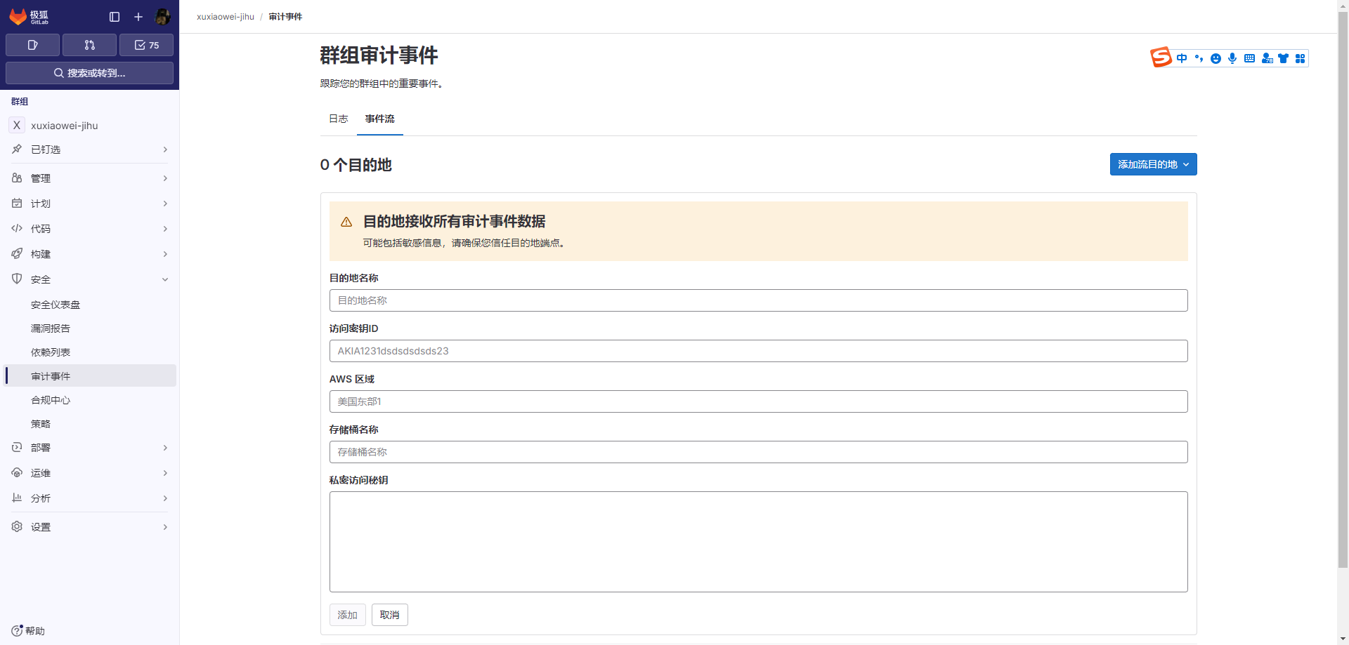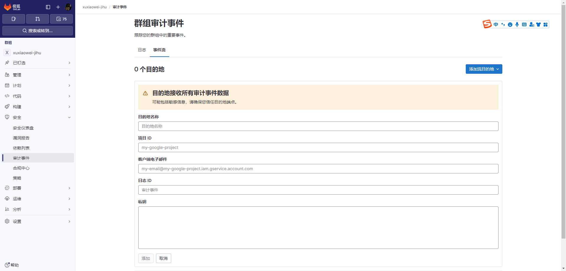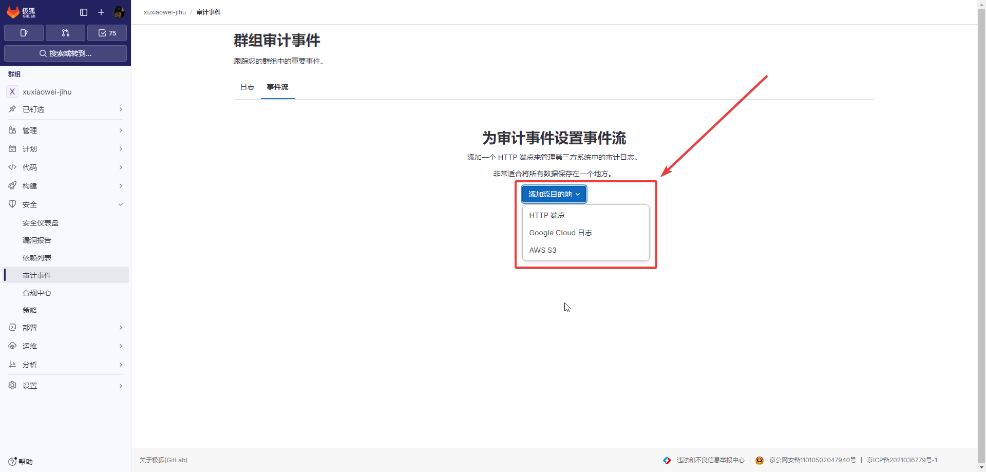 可将群组审计事件发送到HTTP端点、Google Cloud 日志、AWS S3(对象储存)