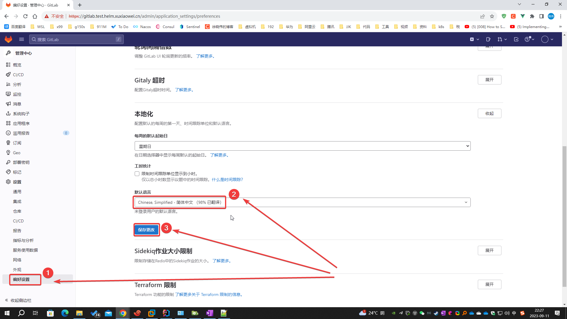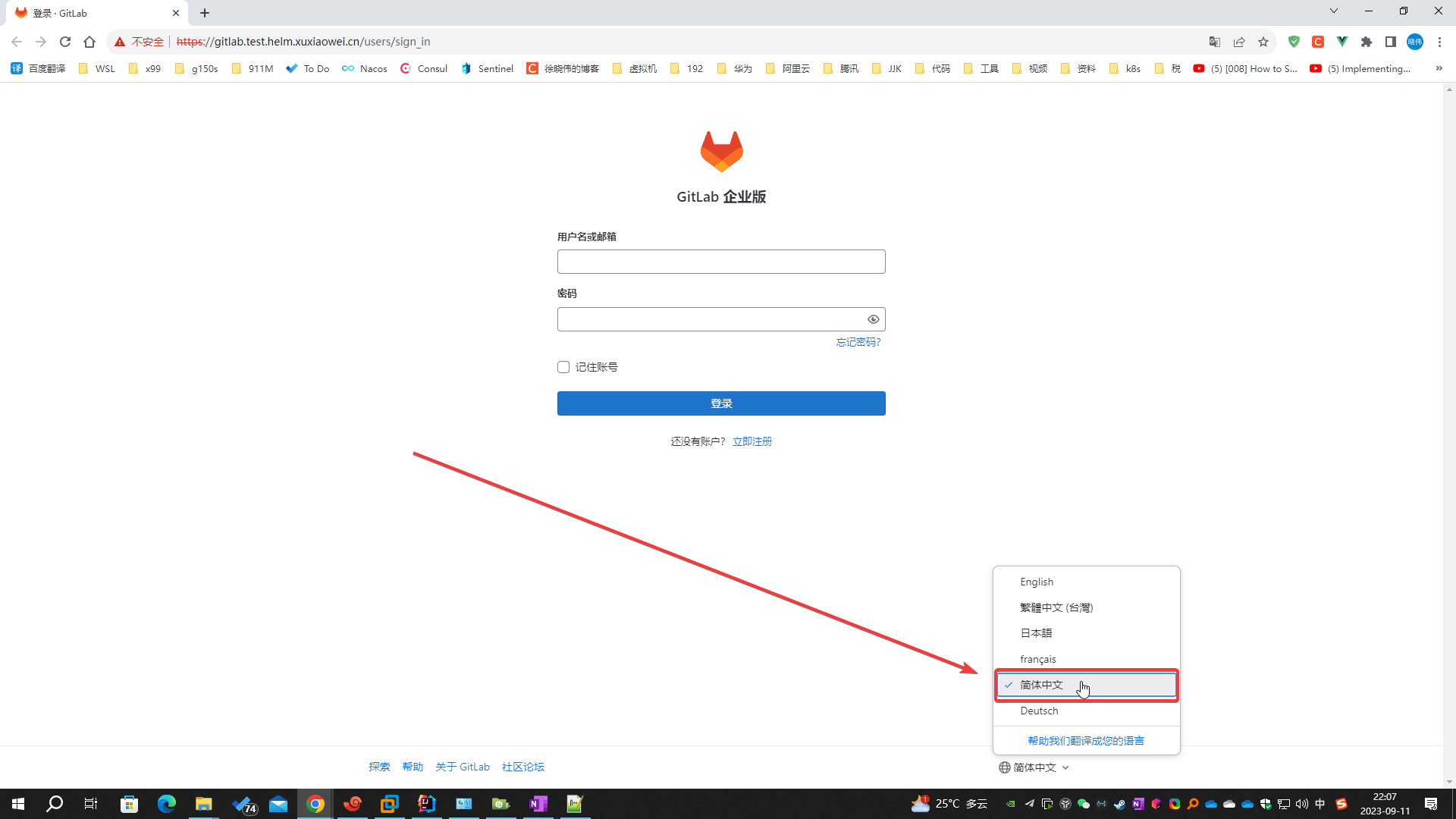 点击 继续前往gitlab.test.helm.xuxiaowei.cn(不安全) ,可选择 中文
