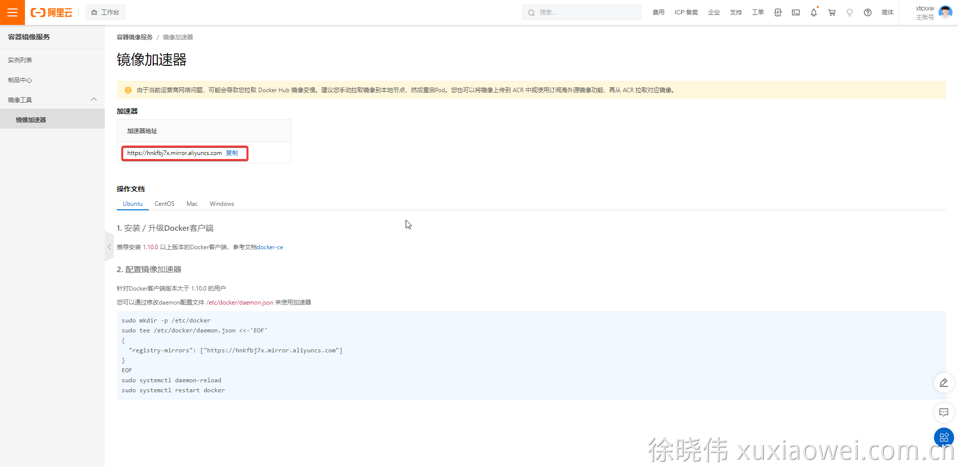 访问 阿里云-容器镜像服务,查看自己账户下镜像加速地址