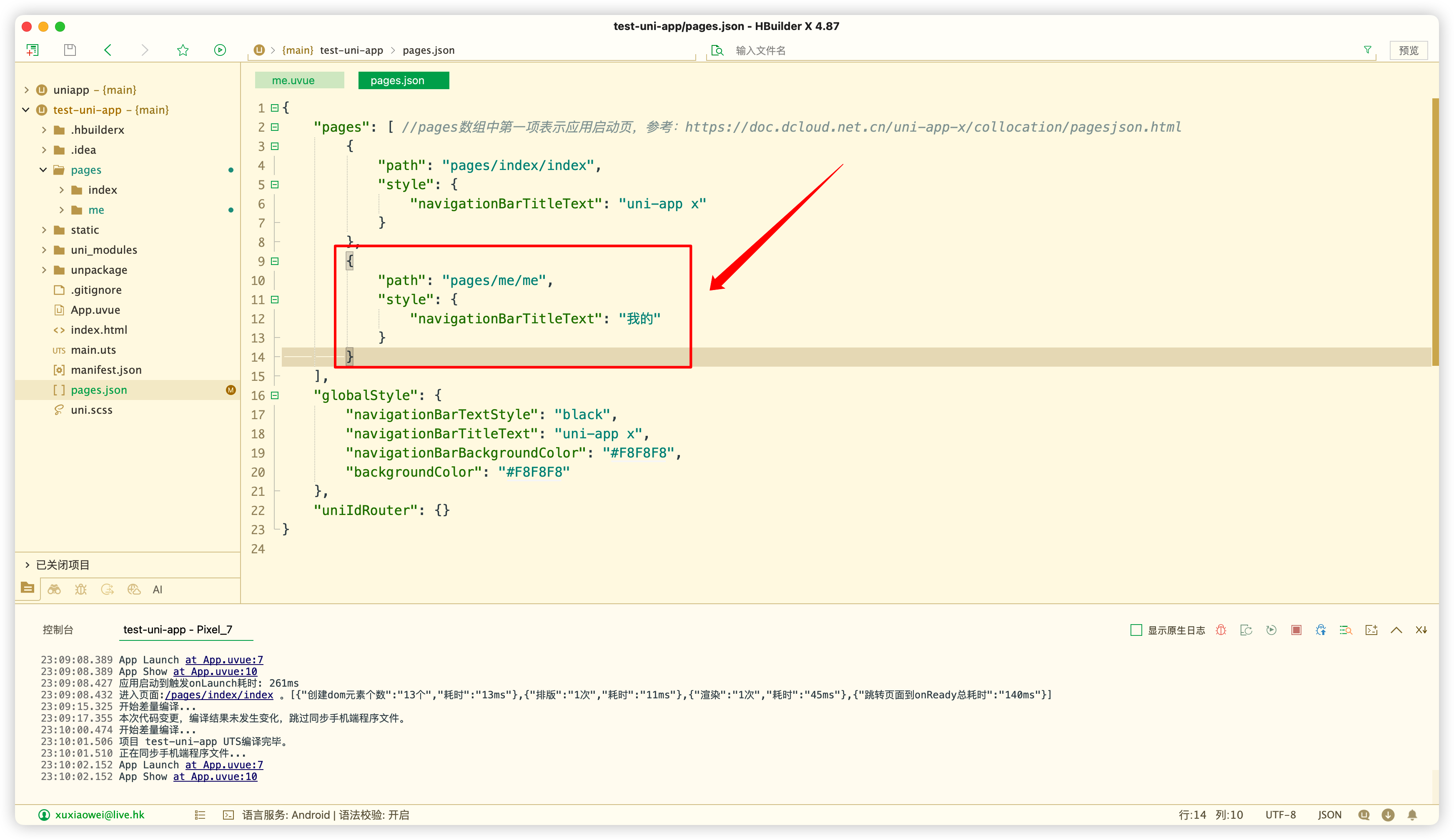 在pages.json中注册的效果
