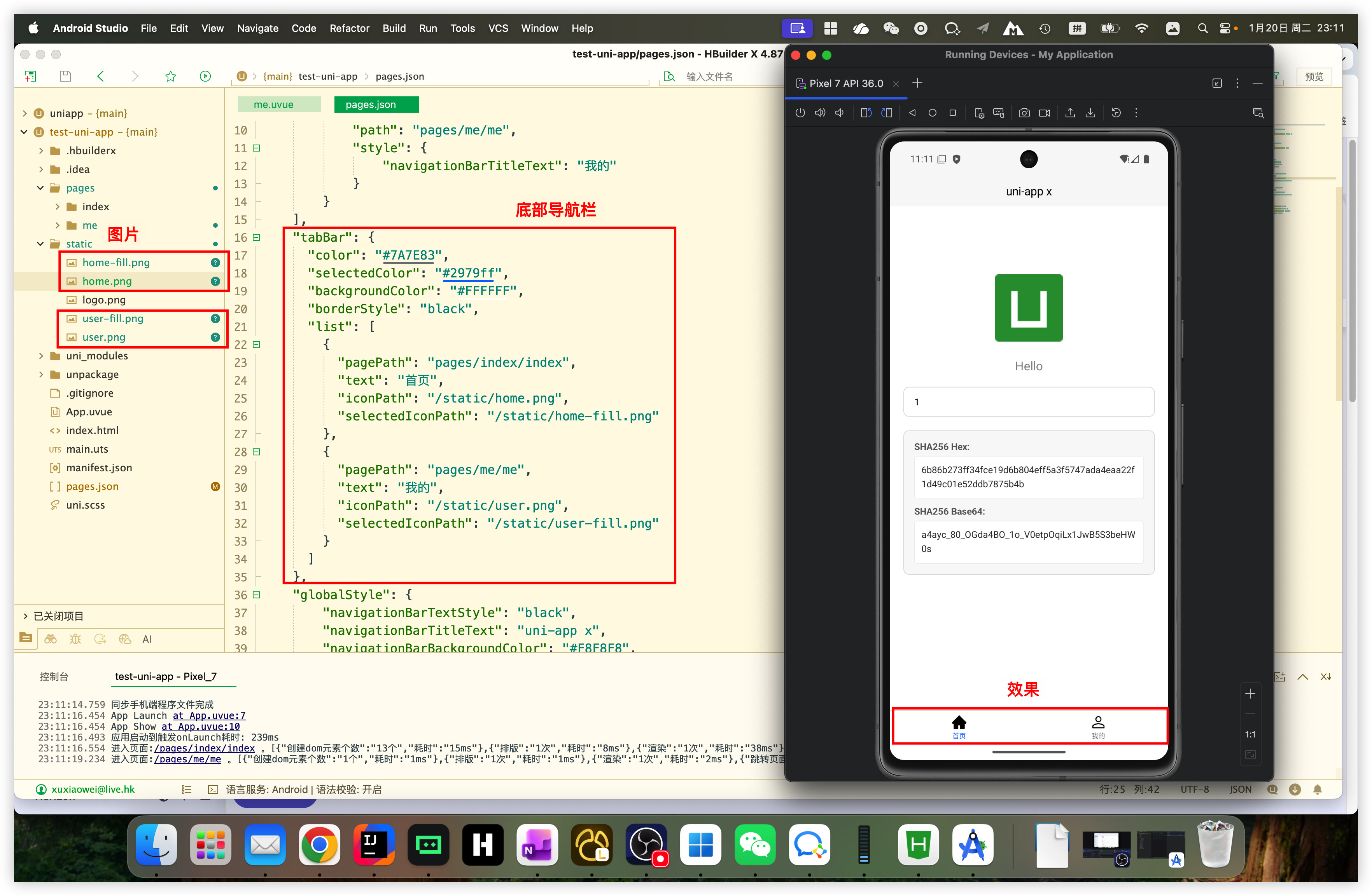 添加的位置与效果{ "tabBar": { "color": "#7A7E83", "selectedColor": "#2979ff", "backgroundColor": "#FFFFFF", "borderStyle": "black", "list": [ { "pagePath": "pages/index/index", "text": "首页", "iconPath": "/static/home.png", "selectedIconPath": "/static/home-fill.png" }, { "pagePath": "pages/me/me", "text": "我的", "iconPath": "/static/user.png", "selectedIconPath": "/static/user-fill.png" } ] } }